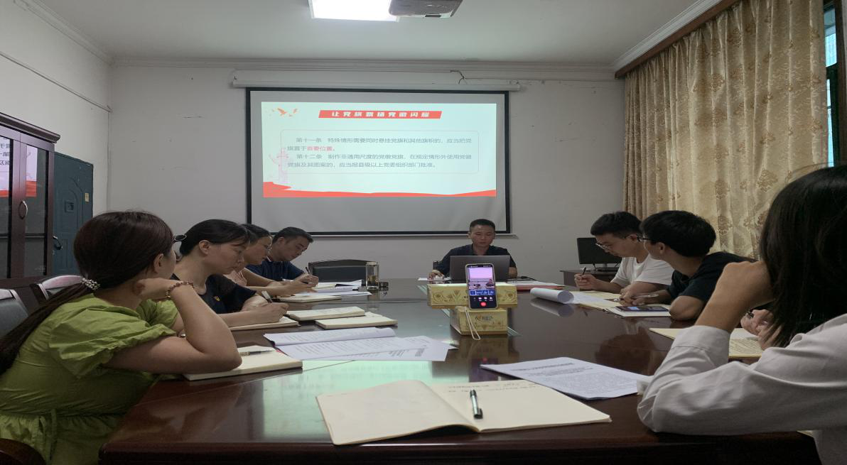《中国共产党党徽党旗条例》是我们党历史上第一部关于党徽党旗的基础主干法规,是党徽党旗制作、使用、管理的基本遵循。现场,刘冰杰同志带领与会人员对《中国共产党党徽党旗条例》中关于党徽党旗制作、使用、管理和监督等24条内容进行了详细的解读学习。