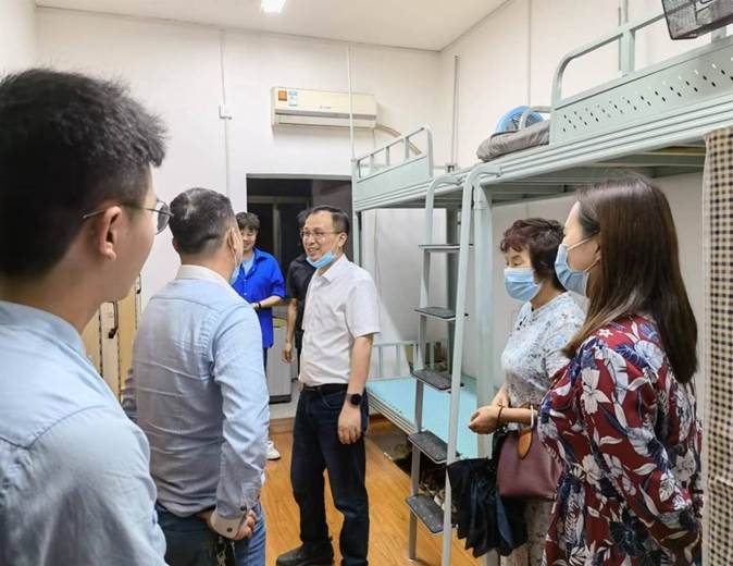 2022年4月27日晚,副校长刘建勋在研究生教育教学部彭健民主任、向瑞桃副书记、周丽华副主任的陪同下来到研究生宿舍──国培楼进行“三联系”活动。