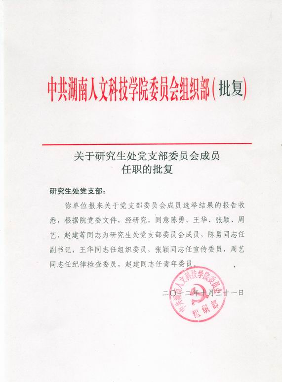 组织部关于研究生处党支部委员会成员任职的批复