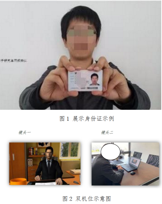 7、进入视频复试系统后,手持有效二代居民身份证(务必用不透明胶布将姓名遮住)向面试专家展示正面。展示身份证标准示例照片(见图1);电脑从正面拍摄,手机摄像头从考生侧后方成45°角进行拍摄(见图2)。考生如有困难,无法自行准备考场条件,应及时向beat365说明情况,根据beat365建议解决问题。
