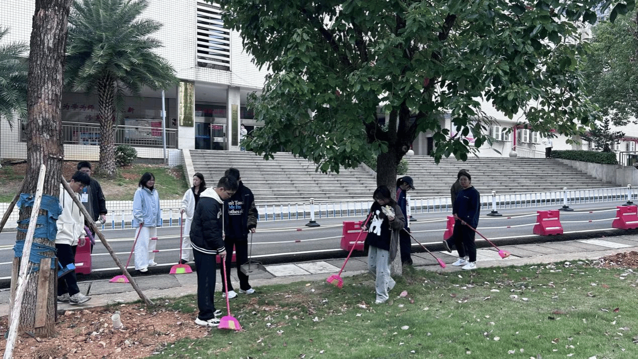 活动伊始,同学们手持卫生工具,分工协作,在划分的区域中尽心打扫,葱绿的树林里穿梭着一个个勤劳的身影,劳动的真谛在此展现的淋漓尽致。大家以饱满的热情投入打扫工作中,在协作中展现青春担当,让逸夫楼前焕发出整洁生机。在同学们的认真打扫下,清洁美好的校园环境令人舒心,同学们劳动的身影更是一道美丽的风景线。
