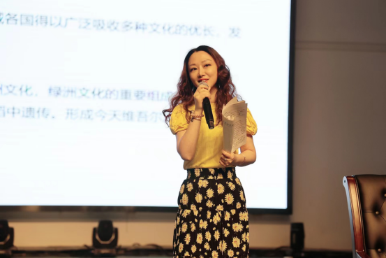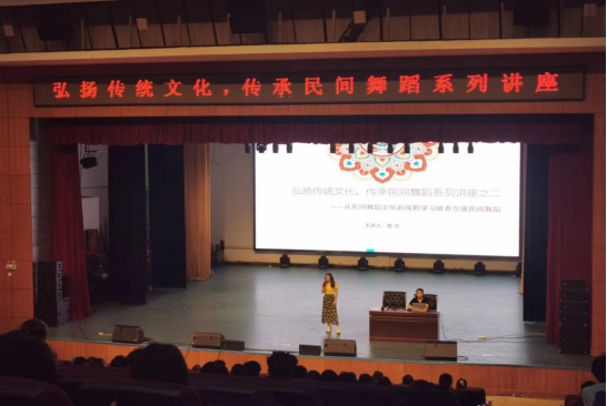 高洁副教授从维吾尔族地域、文化特点,维吾尔族民间舞蹈的种类和表演形式,以及风格特点三个大的方面进行了讲解。讲座深入浅出,形式多样,有老师的示范,学生的表演,作品的解读等,从多个角度展示维吾尔族舞蹈独特的风格,将维吾尔族民间舞蹈别具特色,具有异域风情尽情地展示出来,让大家在舞蹈学习中感受传统文化,在传统文化中感受民族精神。