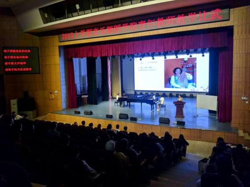 2019年4月9下午两点半,为配合学校本年度青年教师教学比武活动以及顺利通过学校审核评估,加强课堂教学管理,提高教师课堂教学水平与能力,音乐舞蹈学院在逸夫楼音乐厅举办了青年教师课堂教学比武。为组织好本次活动,音舞学院邀请学校督导组陈征南教授、杨竟成副教授、欧阳晨副教授、宫维民副教授和在院内随机抽选部分职称高、教学能力强和教学经验丰富的专任教师担任评委,音乐舞蹈学院领导班子和全体专任教师一起现场聆听和观摩整个教学比武全过程,本次教学比武由李旭开副院长担任大赛主持。