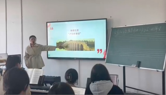 此次课堂思政示范课堂教学是构建全员、全程、全课程育人格局,全面落实立德树人根本任务的有效途径。课程主题围绕爱国主义主题教育歌曲《卢沟谣》的弹唱为中心,从挖掘教材中爱国主义、集体主义、革命精神等价值体系,引导广大青年不断增进对党领导下社会主义的政治认同、思想认同、理论认同、情感认同,始终保持着对于远大理想和奋斗目标的清醒认知和执着追求,不仅要做德艺双馨为民服务的艺术工作者,同时要努力成为立大志、明大德、成大才、担大任的“复兴栋梁”。