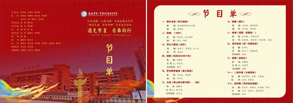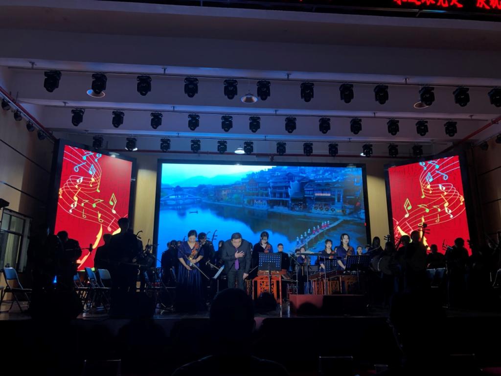 本次音乐会,共有十二首经典作品。首先,音乐舞蹈学院院长周邦春指挥民乐团合奏《欢乐潇湘》,奏出了每一位潇湘人民内心的生活热情,引起了在场听众的共鸣。随后由高洁、邱毅编排,谭波林、吴正张等带来的群舞《守护》更是将红色精神印刻在了每一个人的心中。唐亚平、罗慈花、王一民等师生带来的男女三重唱《向往》,唱出了每一个人心中对更美好生活的追求。随着歌曲结束,星星中学的2103班带来了群舞表演《我和2035有个约》,舞出了他们对未来国家更加繁荣的美好期望。由邓启龙、高翔等带来的萨克斯管重奏《春之歌谣》也使听众记忆犹新,悠扬的旋律正如曲目一样,象征着党和国家如春天般欣欣向荣的样貌。星星中学2005班随后带来了合唱《看山看水看中国》和《路》,展现出在中国共产党的领导下,国家从站起来、富起来到强起来的伟大飞跃。由刘仲春、肖双靖创编,吕芷琪、钱敏莉表演的群舞《国礼》及禹仕鹏、闵俊凤等带来的朗诵《祖国,我爱你!》,都表达了每一个中国人民对祖国及中国文化传统深沉的爱。在这之后,向章元带来了男声独唱《把一切献给党》,坚定的唱出了每个人为党无私奉献的决心。星星中学2108班带来的群舞《茉莉花》及由石瑾、颜春英指导,杨罗辉庆、徐茜、王春晓带来的二胡合奏《太极琴侠》,给观众、听众们带来了美的享受。最后,袁永忠、朱燕聪、杨鉴老师负责演唱,张琼艺术指导,于琴、陈俏含、廖艳华等负责伴舞的歌伴舞表演《我和我的祖国》将氛围推到了最高点,听众们都无比激动、心潮澎湃。在热烈的掌声中,活动圆满结束。