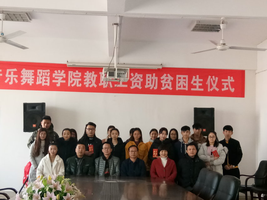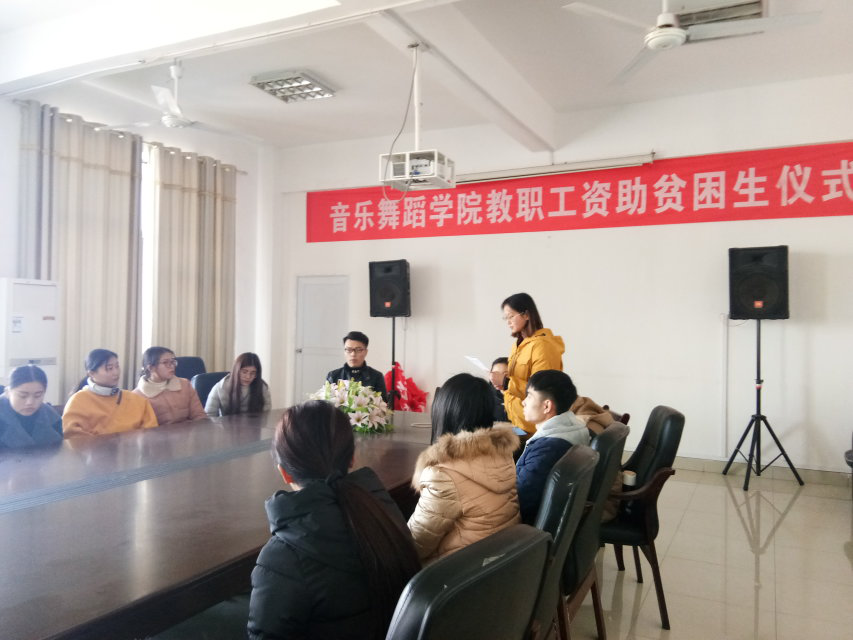 2017年12月19日下午2:30我院在逸夫楼会议室展开了教职工资助贫困生仪式。参加资助仪式的有音乐舞蹈学院院长谢坚强,党总支书记陈功平,副书记周邦春,以及全体辅导员老师。此次资助仪式上共有19名贫困生接受音乐舞蹈学院教师的资助,资助金额7600元。