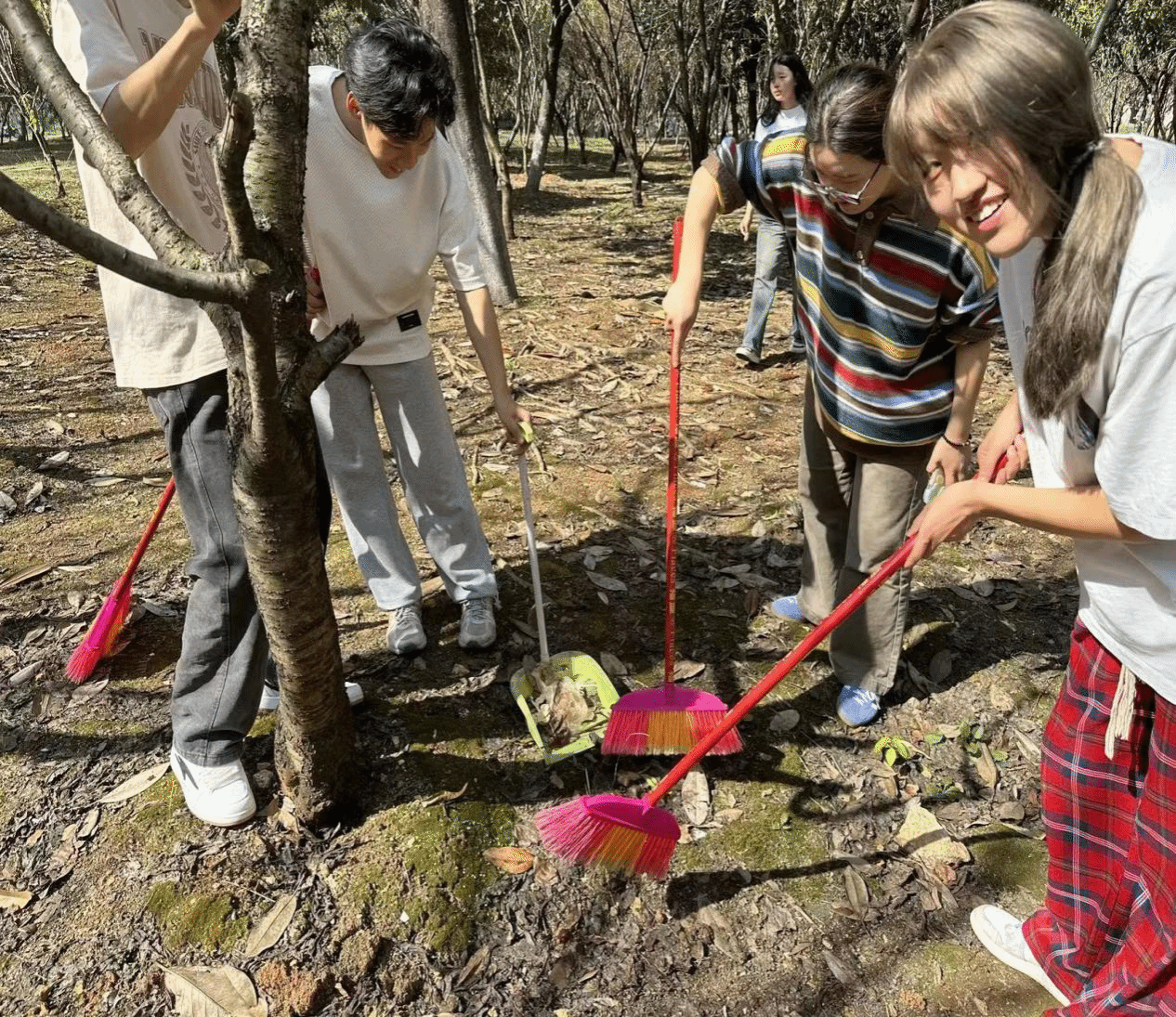 (大一志愿者们在草坪打扫枯叶)