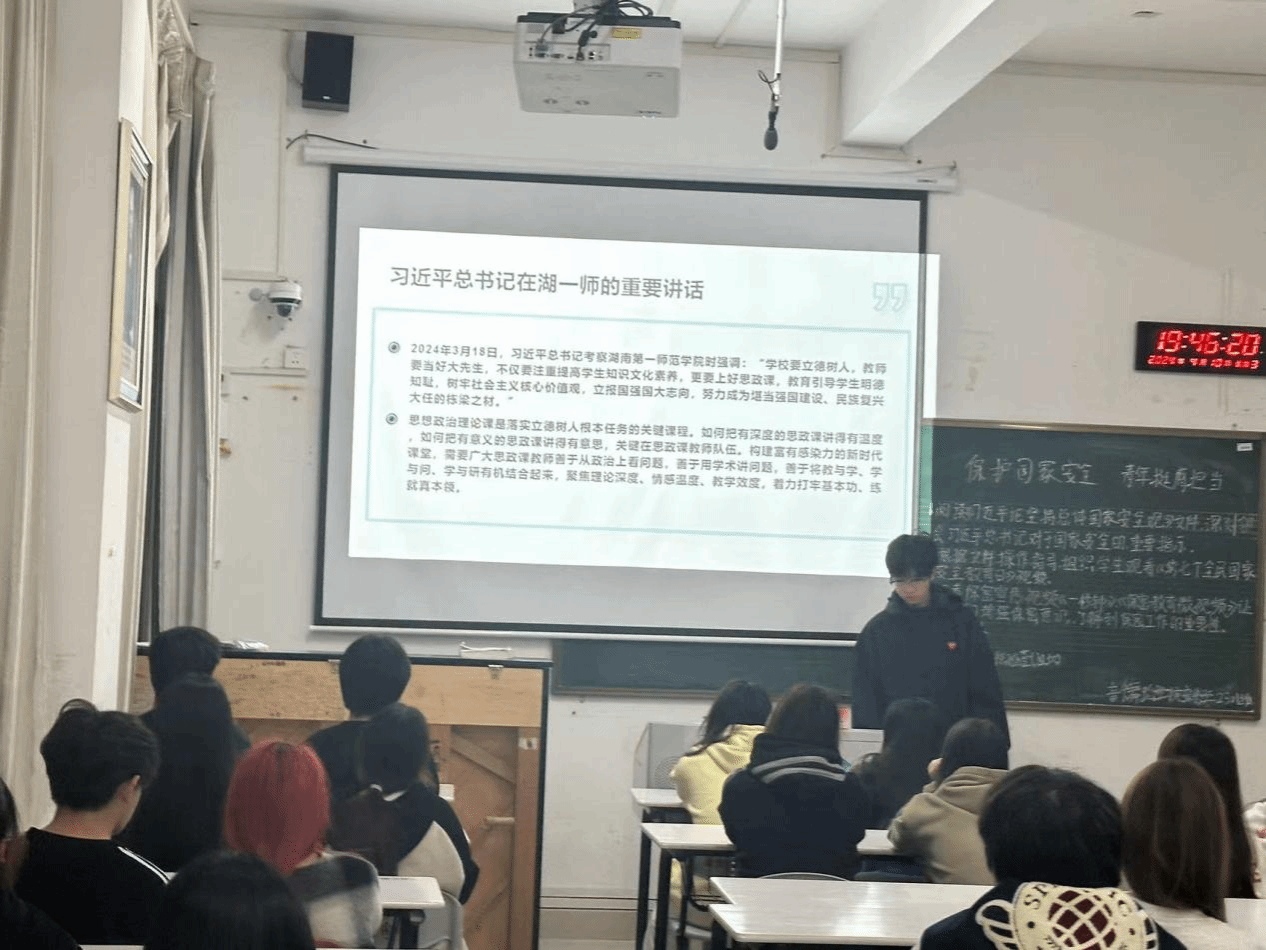 2024年4月10日晚自习 ,音乐舞蹈学院团总支组织2023级全体同学在逸夫楼召开“保护国家安全 青年挺膺担当”的主题团课。