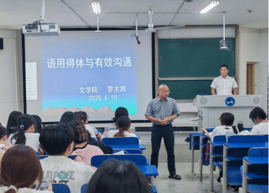 2025年6月10日,文学院秘书学专业集中实践教学周第四场讲座开讲。本次讲座由文学院罗主宾院长主讲,讲座主题为“语用得体与有效沟通”。罗主宾院长的精彩讲座,为秘书学专业的学生们带来了一场关于汉语沟通技巧与语言魅力的知识盛宴。