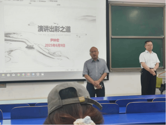 讲座正式开始前,张峰老师为同学们介绍此次讲座主要目的和主讲人尹钟宏书记。讲座伊始,尹书记以自身工作经历引入,讲述了演讲口才的重要性,指出“要具备一定的口才,才能立于不败之地”;接着选用“烛邹亡鸟”和“顾维钧巴黎和会发言”两个经典故事,前者剖析语言表达的逻辑性,后者展现演讲中情感与立场的力量,引导学生感悟语言在沟通中的关键作用;随后,尹书记结合实例,简明阐述演讲的概念与形式,强调演讲是“语言艺术与思想传递的结合”,指出普通话是演讲的基础“门面”,个人知识厚度决定口才高度。讲座尾声,尹书记带领全体学生欣赏《血染的风采永不褪色》,直观展现优秀演讲作品如何通过文字与表达传递精神力量。