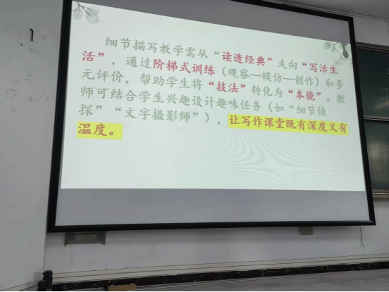 随后,张赛贤主任围绕“现物于微处落墨,运笔至细处传神——以七年级下册第三单元为例探究写作教学策略”这一主题,结合教学实际,分享了写作教学的宝贵经验。她以七年级下册第三单元的课文为范例,深入分析在实际教学中,如何引导学生捕捉生活细节,培养观察能力和写作兴趣;如何通过设计巧妙的教学活动,让学生在实践中掌握细节描写的方法与技巧。讲座内容既有理论高度,又紧密联系教学实践,为未来即将走上教师岗位的同学们指明了写作教学的方向。