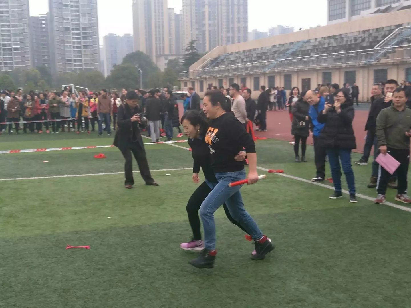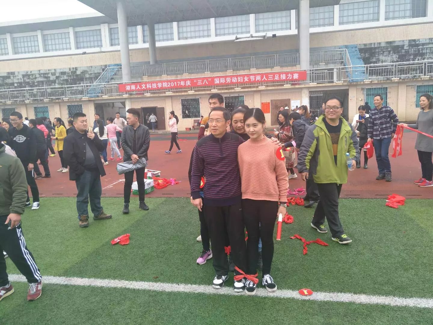 在比赛之前,学校将每个学院的老师分别分成了一队,男女老师相互搭档成一小组,两人三足绕规定路线一圈进行接力赛跑,最后用时最少的队将获得比赛的胜利。