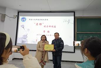 讲座的最后曾老师和大家一起起立大声诵读“为天地立心,为生民立命,为往圣继绝学,为万世开太平”,希望大家将此作为名师一生的追求。随后,曾恕老师代表娄底市曾恕高中网络名师工作室向尹钟宏书记颁发指导老师证书。