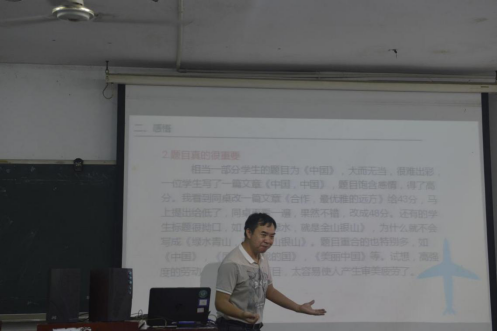 下午,刘健华老师以《典论·论文》中的“文章经国之大业,不朽之盛事”一句为头,开始了第二堂示范课讲解。刘健华老师借今年参与高考作文阅卷的经验,以清晰的思路,给同学们细细讲解了怎样阅好文章、怎样写好文章,对同学们之后的写作带来了很大的影响。