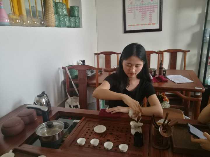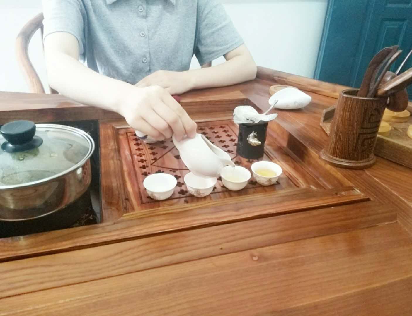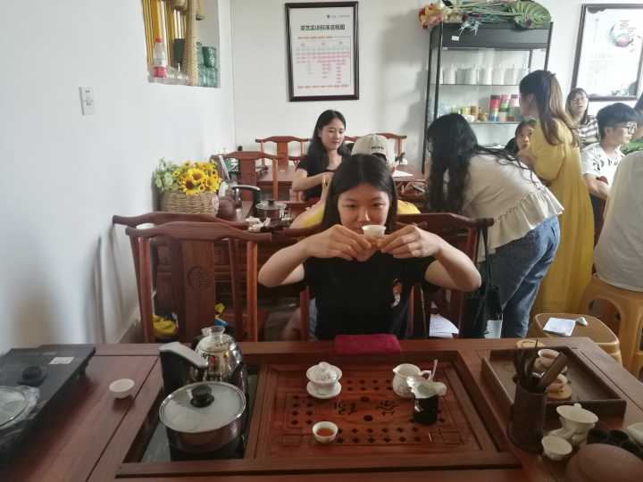 实践方能出真知。同学们掌握了茶艺的理论知识后,便在叶老师的专业指导下进行实践操作了。首先是行茶礼,缓缓入座,轻轻的往下走,面带微笑,身体放平,右手拿茶具,高冲低斟,再定点,注水,放回原位,圆圈画完,揭盖碗洗茶,快速,点一下,煮水冲泡,收水线,定点,清洗品茗杯,右手拿茶夹,定点,洗第一杯茶,绕过第一杯第二杯,倒掉,回茶经,放回在客人面前,揭盖,开始出汤,定点,缝不要留太大,压碗,回位,放好,茶漏放回原来的位置,三个手指捏,给客人观赏汤色,左手回落,茶堪酒满,茶只需八分满,定一下,回位,推回来敬茶,拿一个杯垫,喝茶的茶杯放在杯垫上,举案齐眉,保持15度,最后,在茶盘里将茶杯摆成一个品字行,先给客人喝,再自己喝。一气呵成,这便是茶艺的真正境界了!