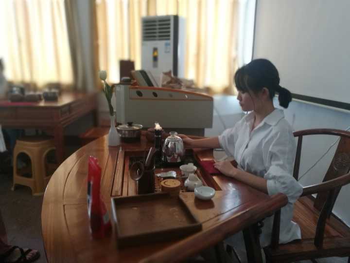 伴着一股芝兰之气,音乐袅袅,一袭黄衣随风荡漾,发丝飞舞,银铃般响亮的笑声传入耳中,如梦幻一般让人沉醉的茶艺师叶红来到了学生面前。