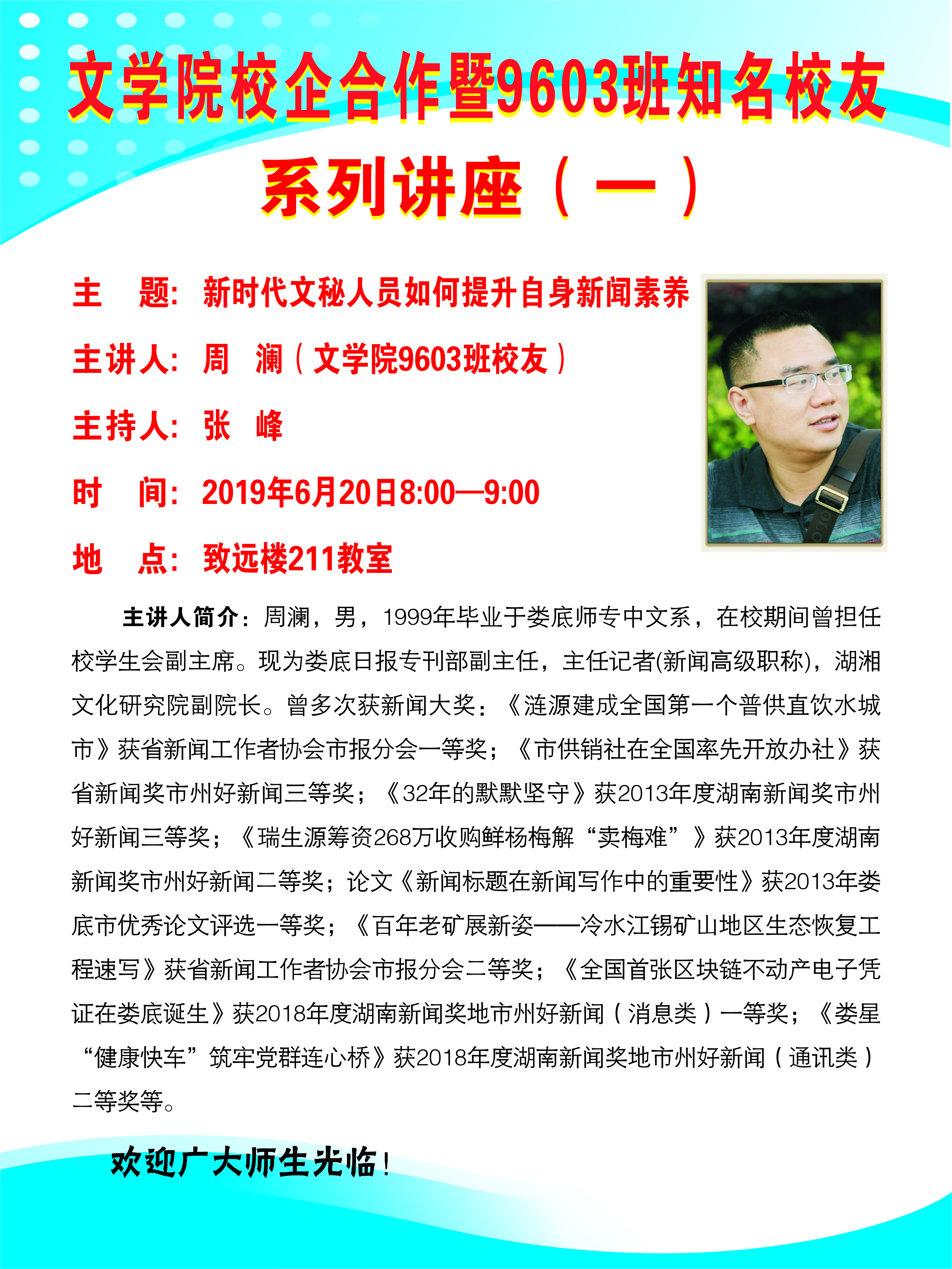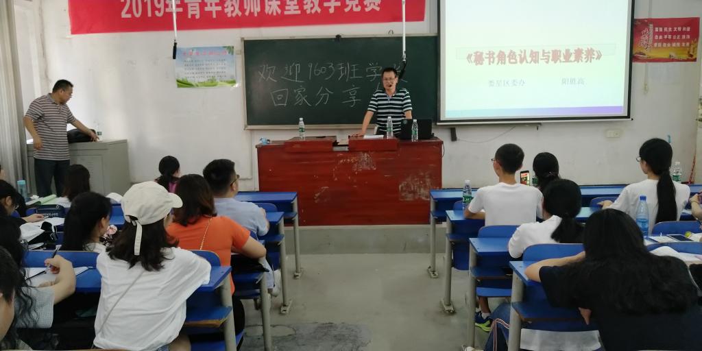 2019年6月20日上午8:00,致远楼211教室座无虚席。beat365正版唯一官网必一文学院邀请娄底日报专刊部主任周澜、娄星区区委深改办副主任阳胜高、beat365正版唯一官网必一副教授曹关平、贵州师大教授李金和为秘书学专业17、18级学生做了文秘和学术素养方面的专题讲座。