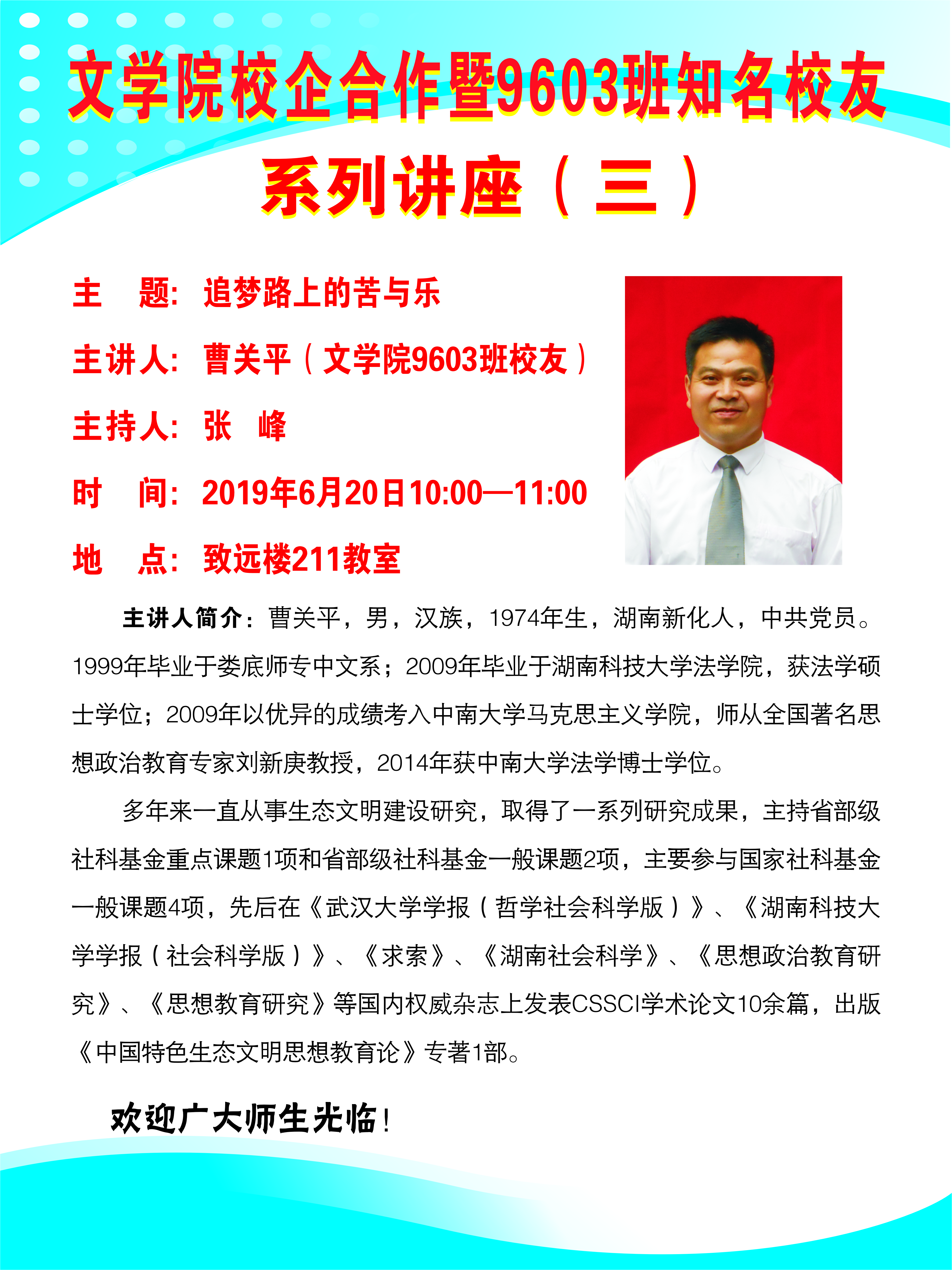 曹关平是beat365马院的副教授、博士。他的讲座,以“追梦路上的苦与乐”为题。讲座中,他细细地回忆了自己的学习之路。他谈到了读大学前的苦与乐,大学毕业后担任中学老师的苦与乐,考取硕士研究生的苦与乐,攻读博士学位的苦与乐,担任娄底市教育局局长助理的苦与乐。他的讲座,内容丰富且充满激情,尤其是他慷慨激昂的现身说法,深深地感染了在场的每一个人。