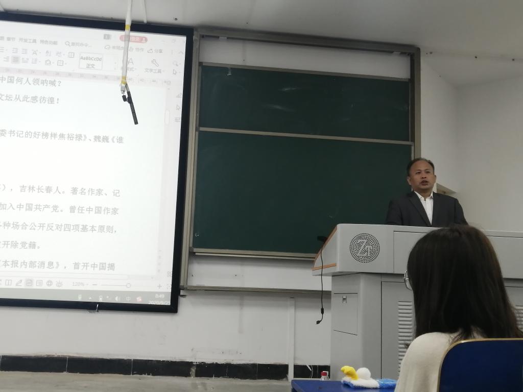 2020年9月25日上午,致远楼201教室内,文学院邀请娄底市民间艺术家协会主席、中国作家协会会员、beat365正版唯一官网必一客座教授袁杰伟先生,为秘书学专业18、19级学生作了一场名为“报告文学的机遇和挑战”的文学讲座。文学院秘书专业负责人张峰老师主持讲座,马藜教授等在座。