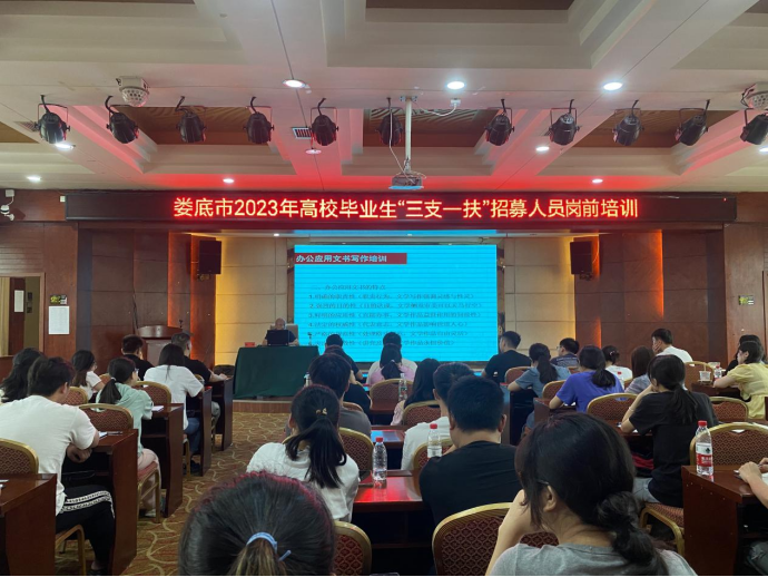 为了引导和鼓励大学生投身基层工作,促进优良青年人才服务基层、支持扶贫、助力乡村振兴,帮助娄底市2023年高校毕业生“三支一扶”招募人员迅速适应工作环境、了解熟悉工作内容、提升公文写作能力,2023年8月29日下午3点,文学院副教授张峰受娄底市人力资源与社会保障局的邀请,在国培中心培训大楼7楼融汇厅讲授公文写作知识。娄底市2023年“三支一扶”人员50余人听取讲座。