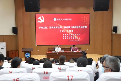 王瑰曙副厅长以《学史力行,深化教育改革,推动地方高校特色化发展》为题,聚焦人才培养目标任务,采用大量的数据实例,从中国教育发展现状、教育评价改革重点任务、湖南教育评价改革实践等方面,就深化教育评价改革,推动地方高校特色发展作了深入浅出的讲解。他强调,地方高校要以《深化新时代教育评价改革总体方案》为指南,落实立德树人根本任务,不断探索地方高校特色办学和高质量发展之路,着力培养德智体美劳全面发展的社会主义建设者和接班人,努力办好中国特色社会主义大学。